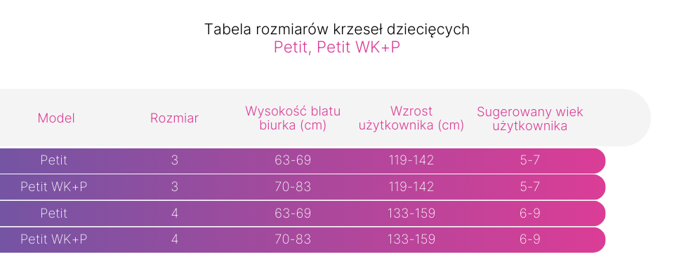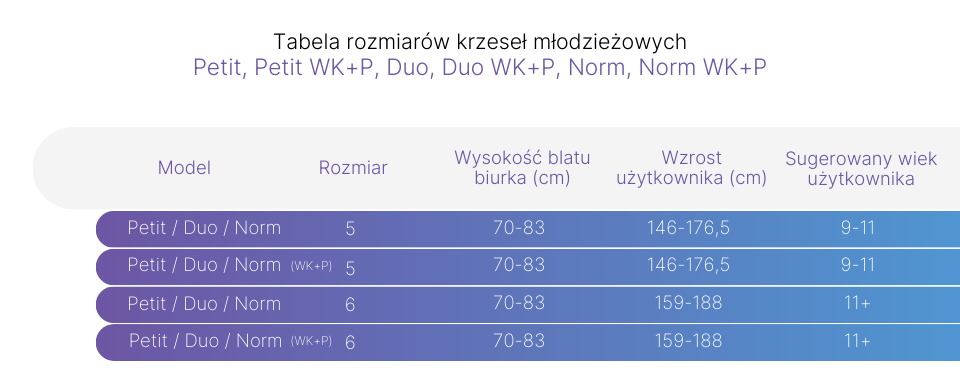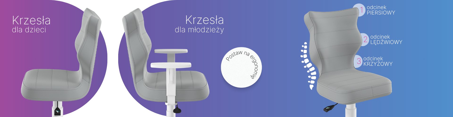 Każde z tych krzeseł jest zaprojektowane tak, aby wspierać prawidłową postawę i zapewniać komfort podczas długotrwałego siedzenia, co jest kluczowe dla zdrowia dziecka. Poniższa grafika obrazuje poszczególne rozmiary oraz modele krzeseł: