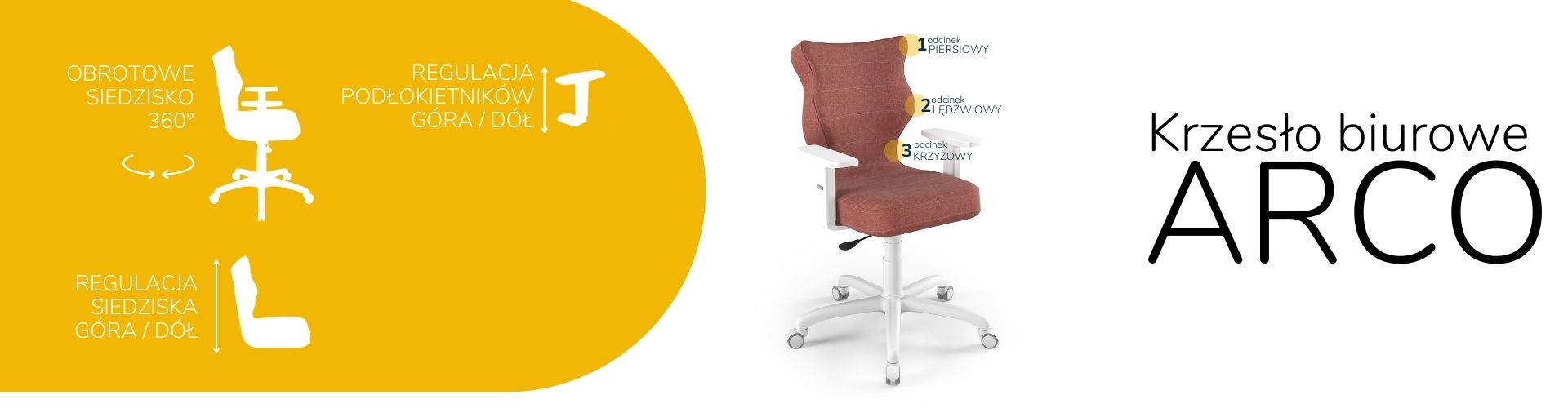 Krzesło Arco to ergonomiczne krzesło biurowe, które zostało stworzone z myślą o osobach pracujących w pozycji siedzącej. Krzesło biurowe tapicerowane Arco zostało wyposażone w miękkie i wygodne siedzisko, aby zapewnić odpowiedni komfort osobie siedzącej przy biurku przez wiele godzin. Co więcej, aby odciążyć kręgosłup, krzesło do biura Arco posiada specjalnie wyprofilowane oparcie. Konstrukcja oraz kształt oparcia zostały wyprofilowane w taki sposób, aby uniknąć przeciążeń kręgosłupa, a także przeciwdziałać powstawaniu wad postawy ciała, takich jak na przykład skolioza. Krzesło biurowe profilowane daje nie tylko stabilne podparcie plecom osoby siedzącej, ale również wpływa na poprawne ich ułożenie. Siedzisko z miękkiego tworzywa nie uciska nóg i jest komfortowe nawet przy kilku godzinach pracy w jednej pozycji.