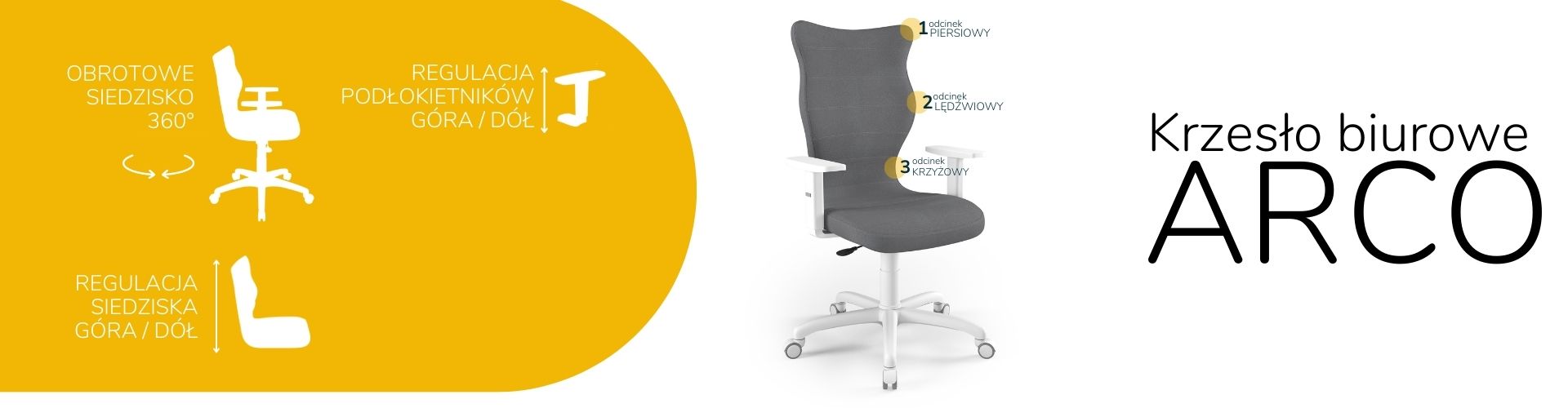 Krzesło Arco to ergonomiczne krzesło biurowe, które zostało stworzone z myślą o osobach pracujących w pozycji siedzącej. Krzesło biurowe tapicerowane Arco zostało wyposażone w miękkie i wygodne siedzisko, aby zapewnić odpowiedni komfort osobie siedzącej przy biurku przez wiele godzin. Co więcej, aby odciążyć kręgosłup, krzesło do biura Arco posiada specjalnie wyprofilowane oparcie. Konstrukcja oraz kształt oparcia zostały wyprofilowane w taki sposób, aby uniknąć przeciążeń kręgosłupa, a także przeciwdziałać powstawaniu wad postawy ciała, takich jak na przykład skolioza. Krzesło biurowe profilowane daje nie tylko stabilne podparcie plecom osoby siedzącej, ale również wpływa na poprawne ich ułożenie. Siedzisko z miękkiego tworzywa nie uciska nóg i jest komfortowe nawet przy kilku godzinach pracy w jednej pozycji.