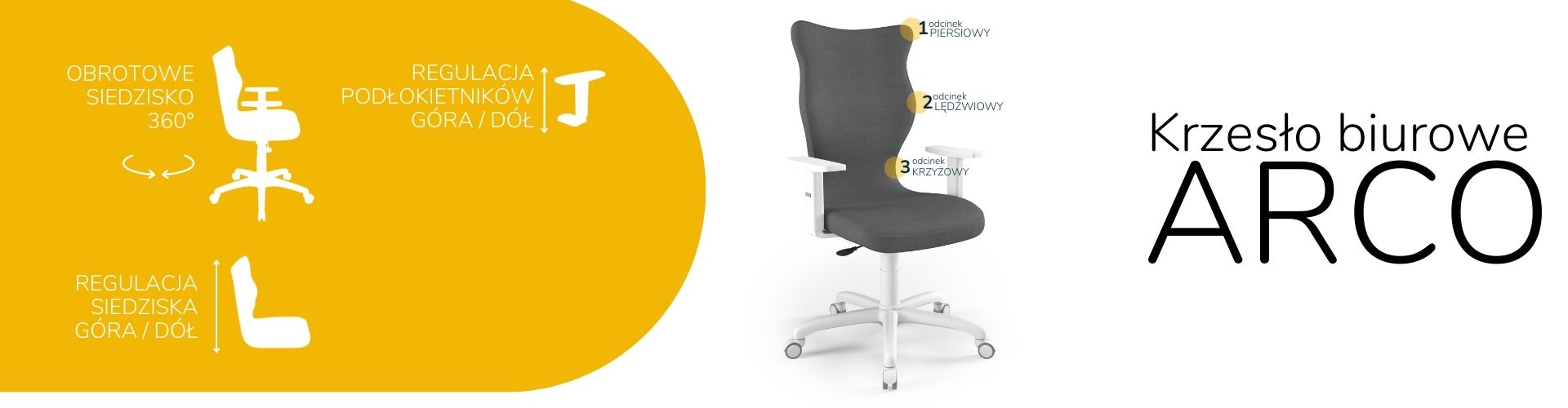 Krzesło Arco to ergonomiczne krzesło biurowe, które zostało stworzone z myślą o osobach pracujących w pozycji siedzącej. Krzesło biurowe tapicerowane Arco zostało wyposażone w miękkie i wygodne siedzisko, aby zapewnić odpowiedni komfort osobie siedzącej przy biurku przez wiele godzin. Co więcej, aby odciążyć kręgosłup, krzesło do biura Arco posiada specjalnie wyprofilowane oparcie. Konstrukcja oraz kształt oparcia zostały wyprofilowane w taki sposób, aby uniknąć przeciążeń kręgosłupa, a także przeciwdziałać powstawaniu wad postawy ciała, takich jak na przykład skolioza. Krzesło biurowe profilowane daje nie tylko stabilne podparcie plecom osoby siedzącej, ale również wpływa na poprawne ich ułożenie. Siedzisko z miękkiego tworzywa nie uciska nóg i jest komfortowe nawet przy kilku godzinach pracy w jednej pozycji.