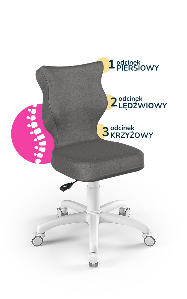 Krzesło dziecięce Petit to ergonomiczne, obrotowe krzesło zaprojektowane z myślą o najmłodszych użytkownikach. Wyprofilowane siedzisko i oparcie wspierają prawidłową postawę, dbając o odcinek piersiowy, lędźwiowy i krzyżowy kręgosłupa. Krzesło posiada podnośnik gazowy, teleskopową osłonkę oraz miękkie kółka, co zapewnia stabilność, bezpieczeństwo i komfort podczas nauki czy pracy przy biurku.