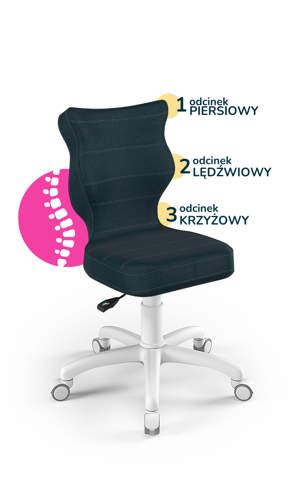 Krzesło dziecięce Petit to ergonomiczne, obrotowe krzesło zaprojektowane z myślą o najmłodszych użytkownikach. Wyprofilowane siedzisko i oparcie wspierają prawidłową postawę, dbając o odcinek piersiowy, lędźwiowy i krzyżowy kręgosłupa. Krzesło posiada podnośnik gazowy, teleskopową osłonkę oraz miękkie kółka, co zapewnia stabilność, bezpieczeństwo i komfort podczas nauki czy pracy przy biurku.