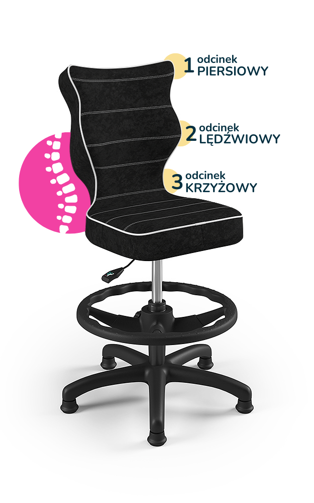 Krzesło Petit z podnóżkiem to ergonomiczne krzesło obrotowe zaprojektowane z myślą o dzieciach, które wspiera prawidłową postawę podczas nauki i pracy przy biurku. Wyprofilowane siedzisko i oparcie zapewniają odciążenie kręgosłupa w odcinku piersiowym, lędźwiowym i krzyżowym, a regulowany podnóżek pozwala dopasować pozycję nóg do wzrostu użytkownika, zwiększając komfort i stabilność podczas siedzenia.
