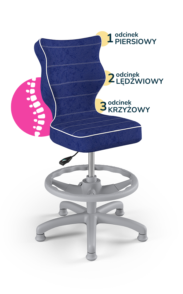 Krzesło Petit z podnóżkiem to ergonomiczne krzesło obrotowe zaprojektowane z myślą o dzieciach, które wspiera prawidłową postawę podczas nauki i pracy przy biurku. Wyprofilowane siedzisko i oparcie zapewniają odciążenie kręgosłupa w odcinku piersiowym, lędźwiowym i krzyżowym, a regulowany podnóżek pozwala dopasować pozycję nóg do wzrostu użytkownika, zwiększając komfort i stabilność podczas siedzenia.