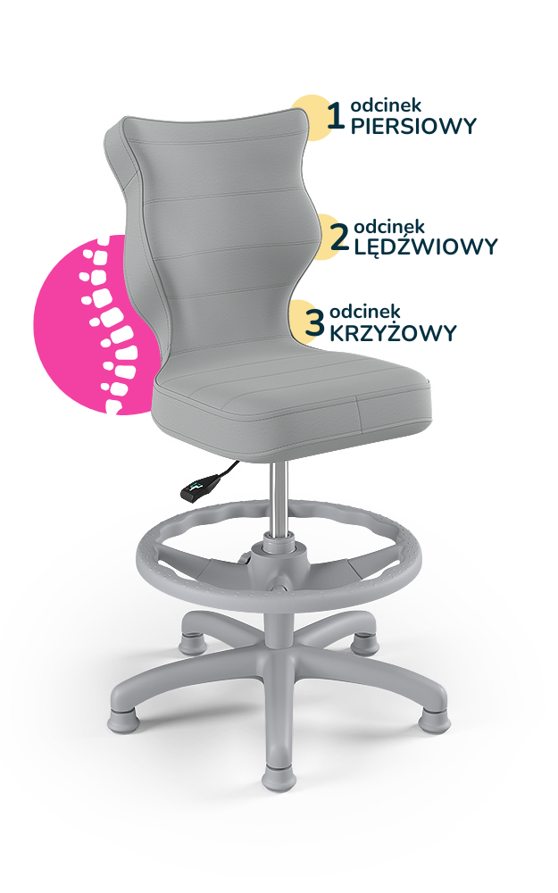 Krzesło Petit z podnóżkiem to ergonomiczne krzesło obrotowe zaprojektowane z myślą o dzieciach, które wspiera prawidłową postawę podczas nauki i pracy przy biurku. Wyprofilowane siedzisko i oparcie zapewniają odciążenie kręgosłupa w odcinku piersiowym, lędźwiowym i krzyżowym, a regulowany podnóżek pozwala dopasować pozycję nóg do wzrostu użytkownika, zwiększając komfort i stabilność podczas siedzenia.