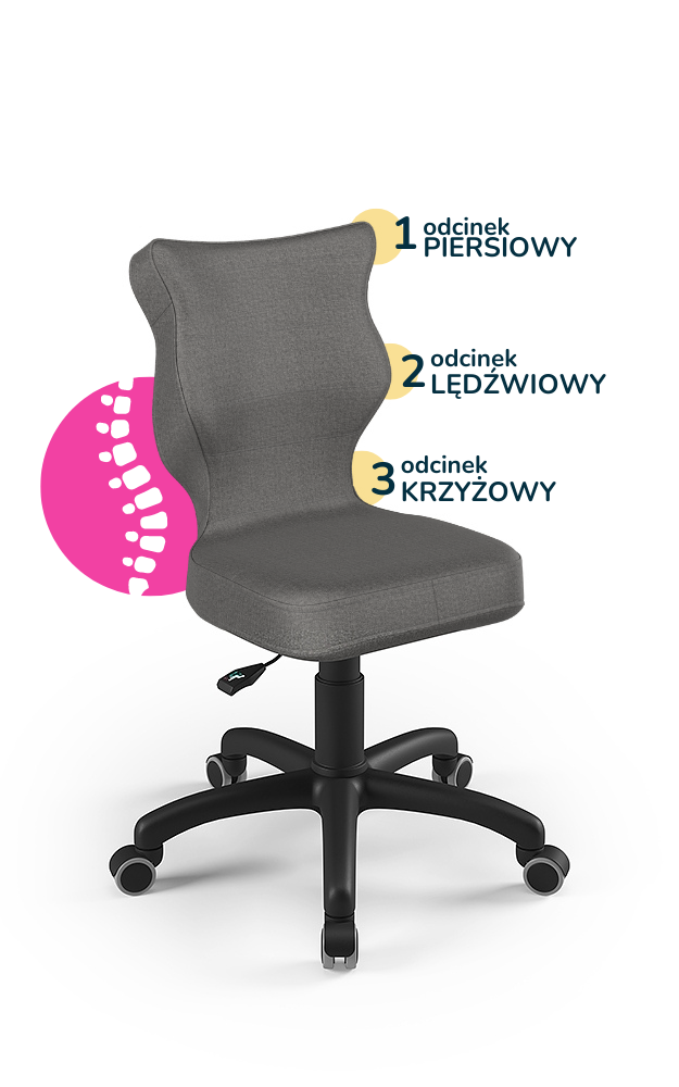 Krzesło dziecięce Petit to ergonomiczne, obrotowe krzesło zaprojektowane z myślą o najmłodszych użytkownikach. Wyprofilowane siedzisko i oparcie wspierają prawidłową postawę, dbając o odcinek piersiowy, lędźwiowy i krzyżowy kręgosłupa. Krzesło posiada podnośnik gazowy, teleskopową osłonkę oraz miękkie kółka, co zapewnia stabilność, bezpieczeństwo i komfort podczas nauki czy pracy przy biurku.