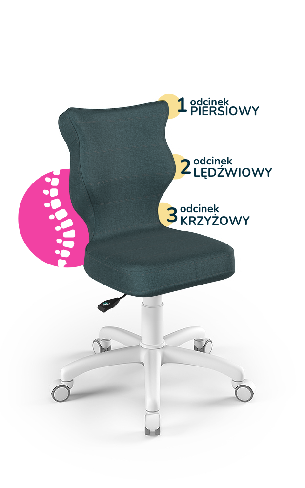Krzesło dziecięce Petit to ergonomiczne, obrotowe krzesło zaprojektowane z myślą o najmłodszych użytkownikach. Wyprofilowane siedzisko i oparcie wspierają prawidłową postawę, dbając o odcinek piersiowy, lędźwiowy i krzyżowy kręgosłupa. Krzesło posiada podnośnik gazowy, teleskopową osłonkę oraz miękkie kółka, co zapewnia stabilność, bezpieczeństwo i komfort podczas nauki czy pracy przy biurku.