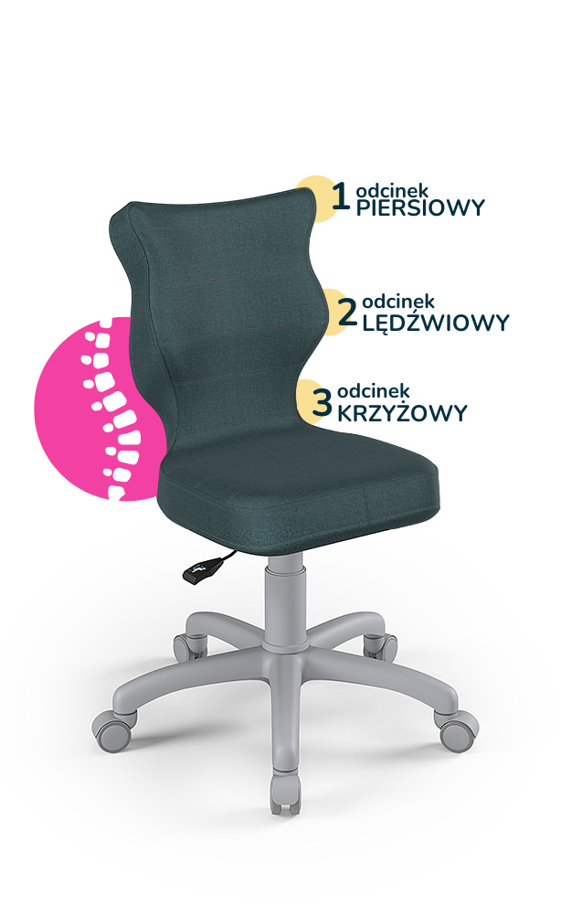 Krzesło dziecięce Petit to ergonomiczne, obrotowe krzesło zaprojektowane z myślą o najmłodszych użytkownikach. Wyprofilowane siedzisko i oparcie wspierają prawidłową postawę, dbając o odcinek piersiowy, lędźwiowy i krzyżowy kręgosłupa. Krzesło posiada podnośnik gazowy, teleskopową osłonkę oraz miękkie kółka, co zapewnia stabilność, bezpieczeństwo i komfort podczas nauki czy pracy przy biurku.
