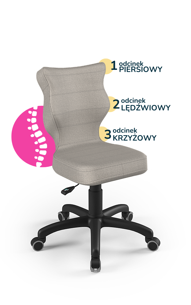 Krzesło dziecięce Petit to ergonomiczne, obrotowe krzesło zaprojektowane z myślą o najmłodszych użytkownikach. Wyprofilowane siedzisko i oparcie wspierają prawidłową postawę, dbając o odcinek piersiowy, lędźwiowy i krzyżowy kręgosłupa. Krzesło posiada podnośnik gazowy, teleskopową osłonkę oraz miękkie kółka, co zapewnia stabilność, bezpieczeństwo i komfort podczas nauki czy pracy przy biurku.