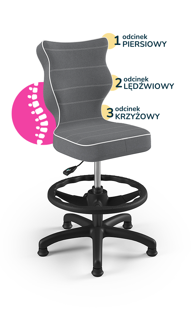 Krzesło Petit z podnóżkiem to ergonomiczne krzesło obrotowe zaprojektowane z myślą o dzieciach, które wspiera prawidłową postawę podczas nauki i pracy przy biurku. Wyprofilowane siedzisko i oparcie zapewniają odciążenie kręgosłupa w odcinku piersiowym, lędźwiowym i krzyżowym, a regulowany podnóżek pozwala dopasować pozycję nóg do wzrostu użytkownika, zwiększając komfort i stabilność podczas siedzenia.