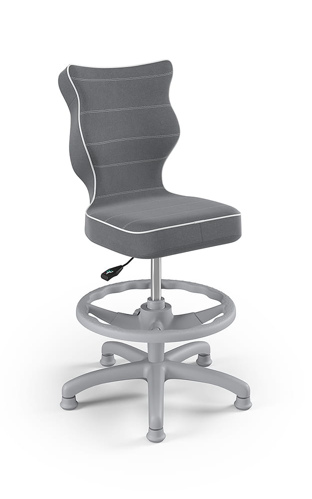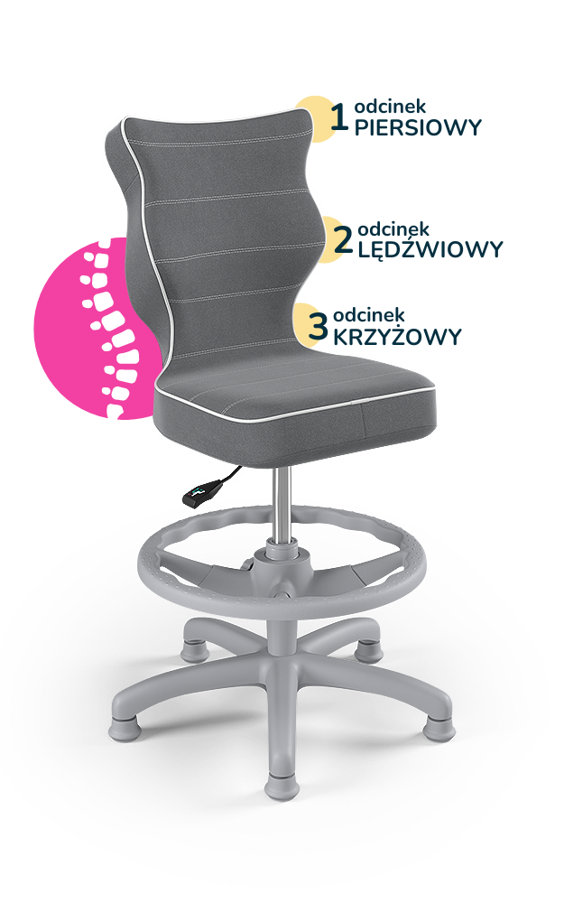 Krzesło Petit z podnóżkiem to ergonomiczne krzesło obrotowe zaprojektowane z myślą o dzieciach, które wspiera prawidłową postawę podczas nauki i pracy przy biurku. Wyprofilowane siedzisko i oparcie zapewniają odciążenie kręgosłupa w odcinku piersiowym, lędźwiowym i krzyżowym, a regulowany podnóżek pozwala dopasować pozycję nóg do wzrostu użytkownika, zwiększając komfort i stabilność podczas siedzenia.