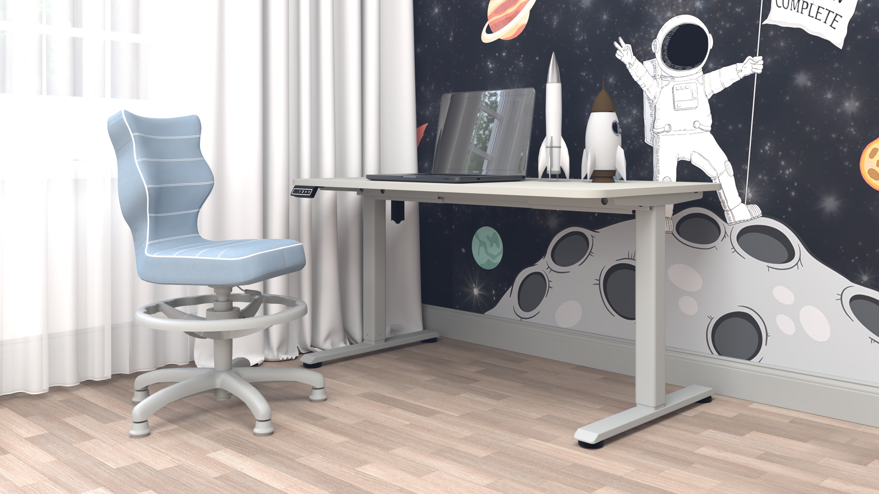 Krzesło Petit z podnóżkiem to ergonomiczne krzesło obrotowe zaprojektowane z myślą o dzieciach, które wspiera prawidłową postawę podczas nauki i pracy przy biurku. Wyprofilowane siedzisko i oparcie zapewniają odciążenie kręgosłupa w odcinku piersiowym, lędźwiowym i krzyżowym, a regulowany podnóżek pozwala dopasować pozycję nóg do wzrostu użytkownika, zwiększając komfort i stabilność podczas siedzenia.