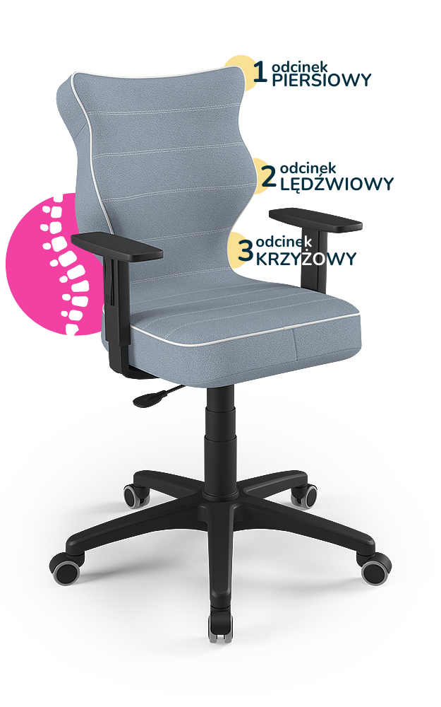 Aby zapewnić odpowiednią ergonomię, krzesła dostępne są w różnych rozmiarach, które należy dobrać w zależności od wieku i wzrostu użytkownika. Właściwy rozmiar gwarantuje, że stopy opierają się płasko na podłodze, kolana są ugięte pod kątem 90°, a kręgosłup pozostaje w naturalnej pozycji. Taka regulacja minimalizuje ryzyko złych nawyków posturalnych oraz dyskomfortu podczas długiego siedzenia.