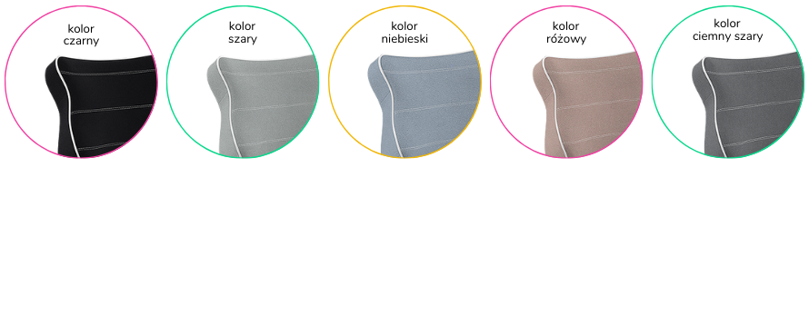 - Kolorystyka: czarny, szary, niebieski, różowy, ciemny szary