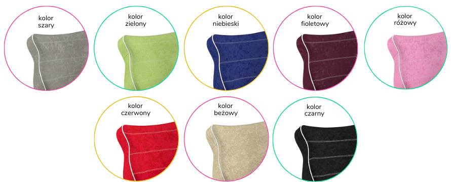 - Kolorystyka: czarny, szary, zielony, niebieski, fioletowy, różowy, czerwony, beżowy