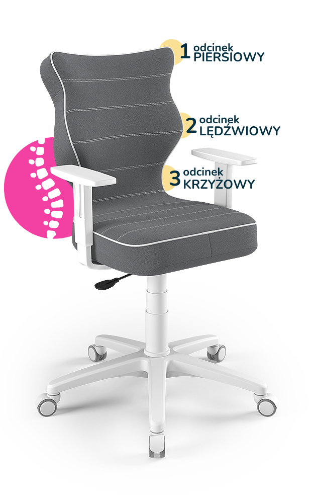 Krzesło młodzieżowe Duo zostało zaprojektowane z myślą o ergonomii i komforcie podczas wielogodzinnej nauki lub pracy przy biurku. Wklęsło-wypukła forma siedziska i oparcia wspiera prawidłowe ułożenie kręgosłupa, odciążając odcinek piersiowy, lędźwiowy i krzyżowy. Dodatkowy podnóżek zapewnia stabilną i wygodną pozycję nóg, a solidna konstrukcja gwarantuje trwałość i bezpieczeństwo użytkowania.