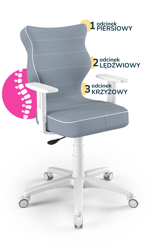 Krzesło młodzieżowe Duo zostało zaprojektowane z myślą o ergonomii i komforcie podczas wielogodzinnej nauki lub pracy przy biurku. Wklęsło-wypukła forma siedziska i oparcia wspiera prawidłowe ułożenie kręgosłupa, odciążając odcinek piersiowy, lędźwiowy i krzyżowy. Dodatkowy podnóżek zapewnia stabilną i wygodną pozycję nóg, a solidna konstrukcja gwarantuje trwałość i bezpieczeństwo użytkowania.