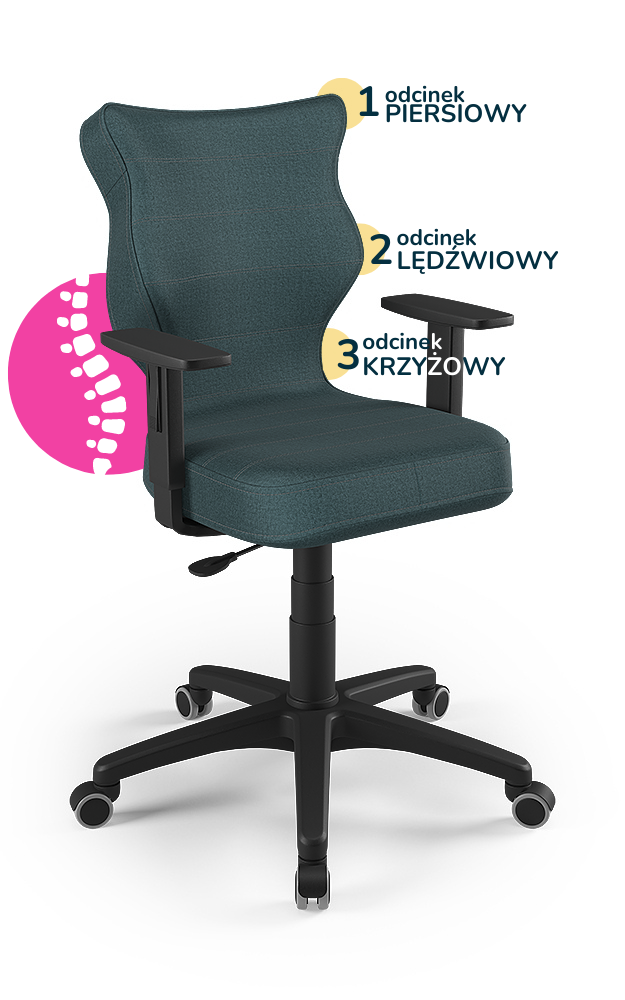 Aby zapewnić odpowiednią ergonomię, krzesła dostępne są w różnych rozmiarach, które należy dobrać w zależności od wieku i wzrostu użytkownika. Właściwy rozmiar gwarantuje, że stopy opierają się płasko na podłodze, kolana są ugięte pod kątem 90°, a kręgosłup pozostaje w naturalnej pozycji. Taka regulacja minimalizuje ryzyko złych nawyków posturalnych oraz dyskomfortu podczas długiego siedzenia.