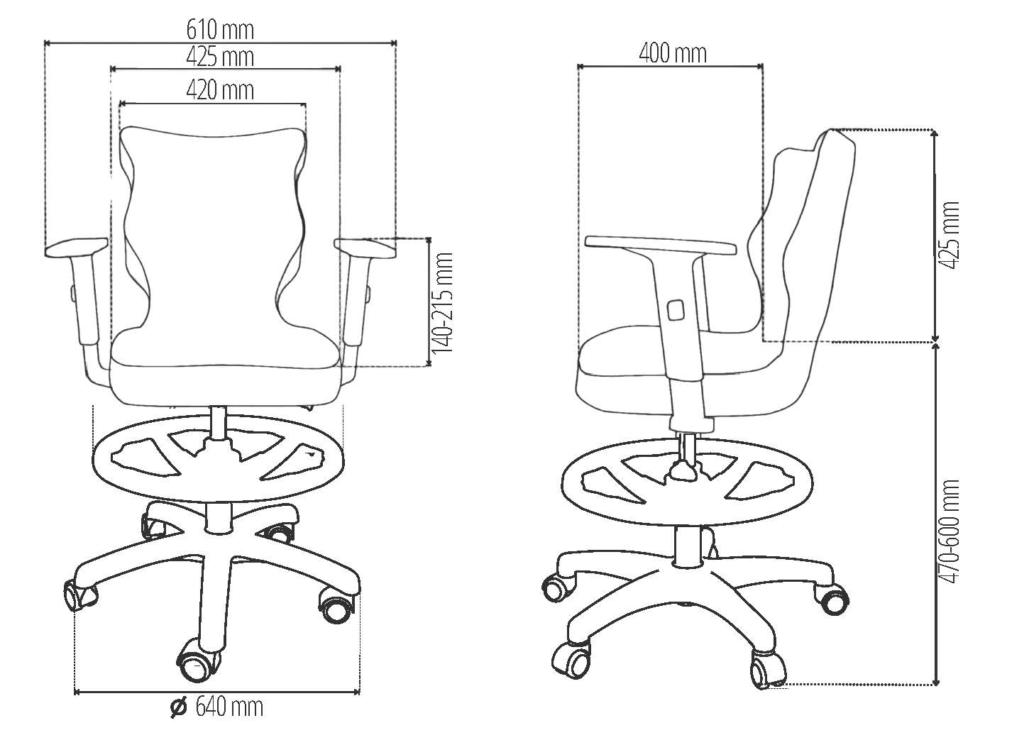 Aby zapewnić odpowiednią ergonomię, krzesła dostępne są w różnych rozmiarach, które należy dobrać w zależności od wieku i wzrostu użytkownika. Właściwy rozmiar gwarantuje, że stopy opierają się płasko na podłodze, kolana są ugięte pod kątem 90°, a kręgosłup pozostaje w naturalnej pozycji. Taka regulacja minimalizuje ryzyko złych nawyków posturalnych oraz dyskomfortu podczas długiego siedzenia.