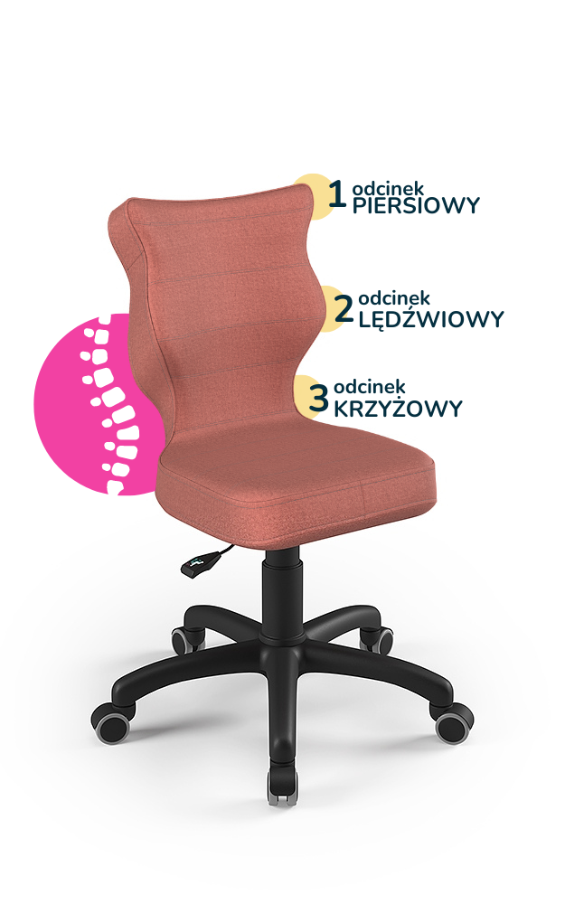 Krzesło dziecięce Petit to ergonomiczne, obrotowe krzesło zaprojektowane z myślą o najmłodszych użytkownikach. Wyprofilowane siedzisko i oparcie wspierają prawidłową postawę, dbając o odcinek piersiowy, lędźwiowy i krzyżowy kręgosłupa. Krzesło posiada podnośnik gazowy, teleskopową osłonkę oraz miękkie kółka, co zapewnia stabilność, bezpieczeństwo i komfort podczas nauki czy pracy przy biurku.