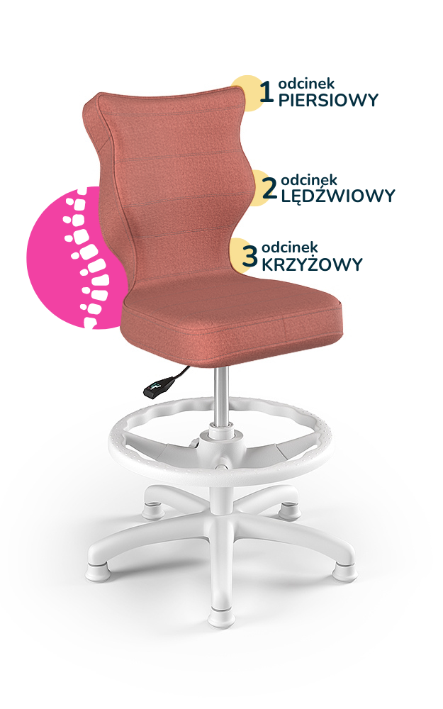 Krzesło Petit z podnóżkiem to ergonomiczne krzesło obrotowe zaprojektowane z myślą o dzieciach, które wspiera prawidłową postawę podczas nauki i pracy przy biurku. Wyprofilowane siedzisko i oparcie zapewniają odciążenie kręgosłupa w odcinku piersiowym, lędźwiowym i krzyżowym, a regulowany podnóżek pozwala dopasować pozycję nóg do wzrostu użytkownika, zwiększając komfort i stabilność podczas siedzenia.