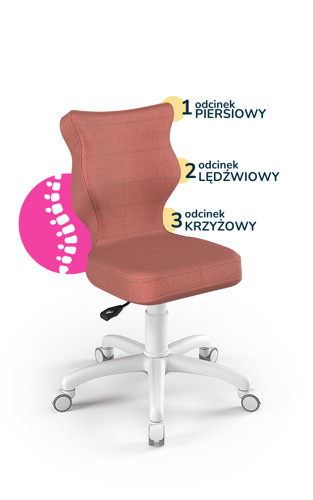 Krzesło dziecięce Petit to ergonomiczne, obrotowe krzesło zaprojektowane z myślą o najmłodszych użytkownikach. Wyprofilowane siedzisko i oparcie wspierają prawidłową postawę, dbając o odcinek piersiowy, lędźwiowy i krzyżowy kręgosłupa. Krzesło posiada podnośnik gazowy, teleskopową osłonkę oraz miękkie kółka, co zapewnia stabilność, bezpieczeństwo i komfort podczas nauki czy pracy przy biurku.