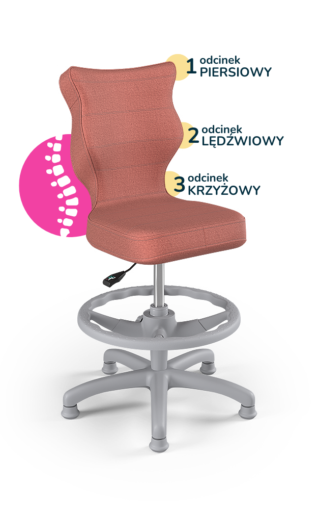 Krzesło Petit z podnóżkiem to ergonomiczne krzesło obrotowe zaprojektowane z myślą o dzieciach, które wspiera prawidłową postawę podczas nauki i pracy przy biurku. Wyprofilowane siedzisko i oparcie zapewniają odciążenie kręgosłupa w odcinku piersiowym, lędźwiowym i krzyżowym, a regulowany podnóżek pozwala dopasować pozycję nóg do wzrostu użytkownika, zwiększając komfort i stabilność podczas siedzenia.
