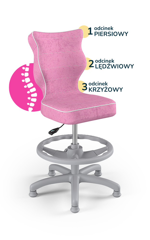 Krzesło Petit z podnóżkiem to ergonomiczne krzesło obrotowe zaprojektowane z myślą o dzieciach, które wspiera prawidłową postawę podczas nauki i pracy przy biurku. Wyprofilowane siedzisko i oparcie zapewniają odciążenie kręgosłupa w odcinku piersiowym, lędźwiowym i krzyżowym, a regulowany podnóżek pozwala dopasować pozycję nóg do wzrostu użytkownika, zwiększając komfort i stabilność podczas siedzenia.